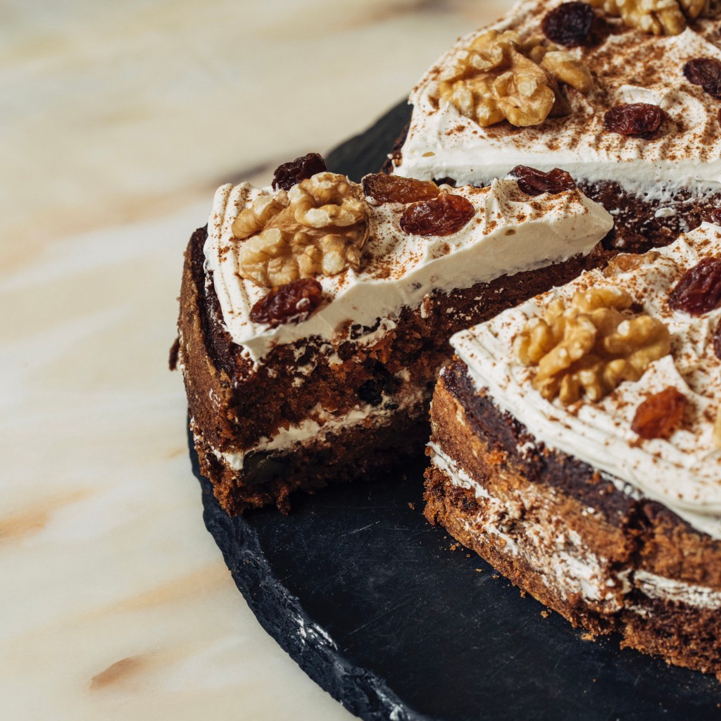 Um bolo rico com frutos secos e o aroma da canela.