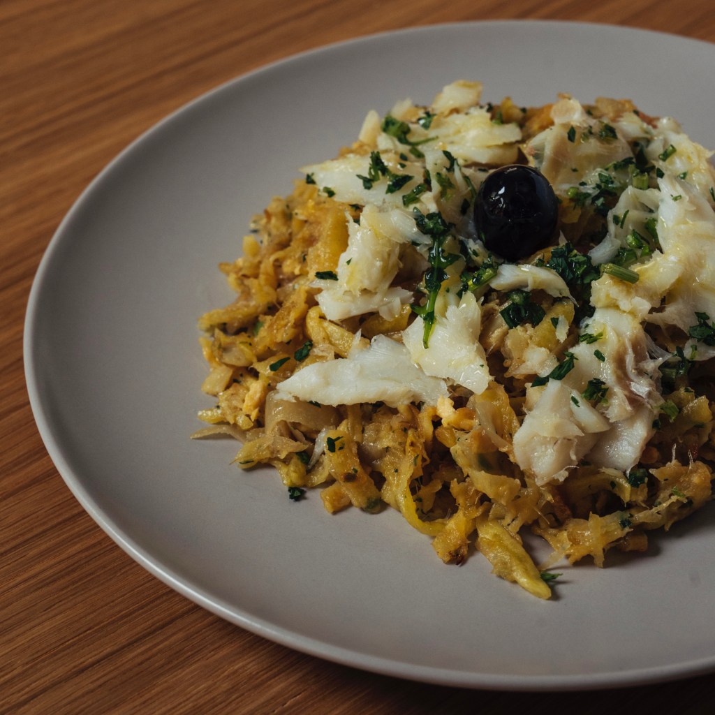 Metade bacalhau da Noruega, metade a nossa batata cozida e esmagada.