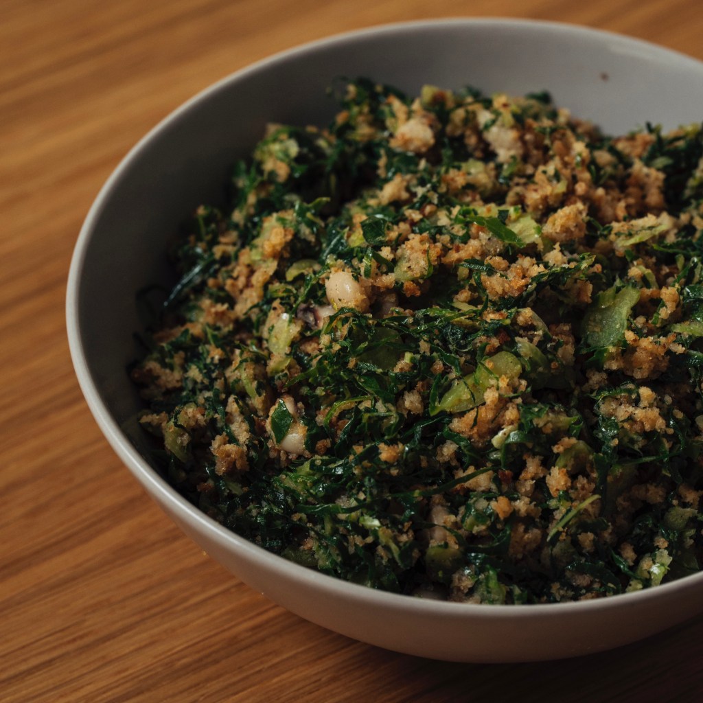 Migas de couve com pedaços de broa de milho.